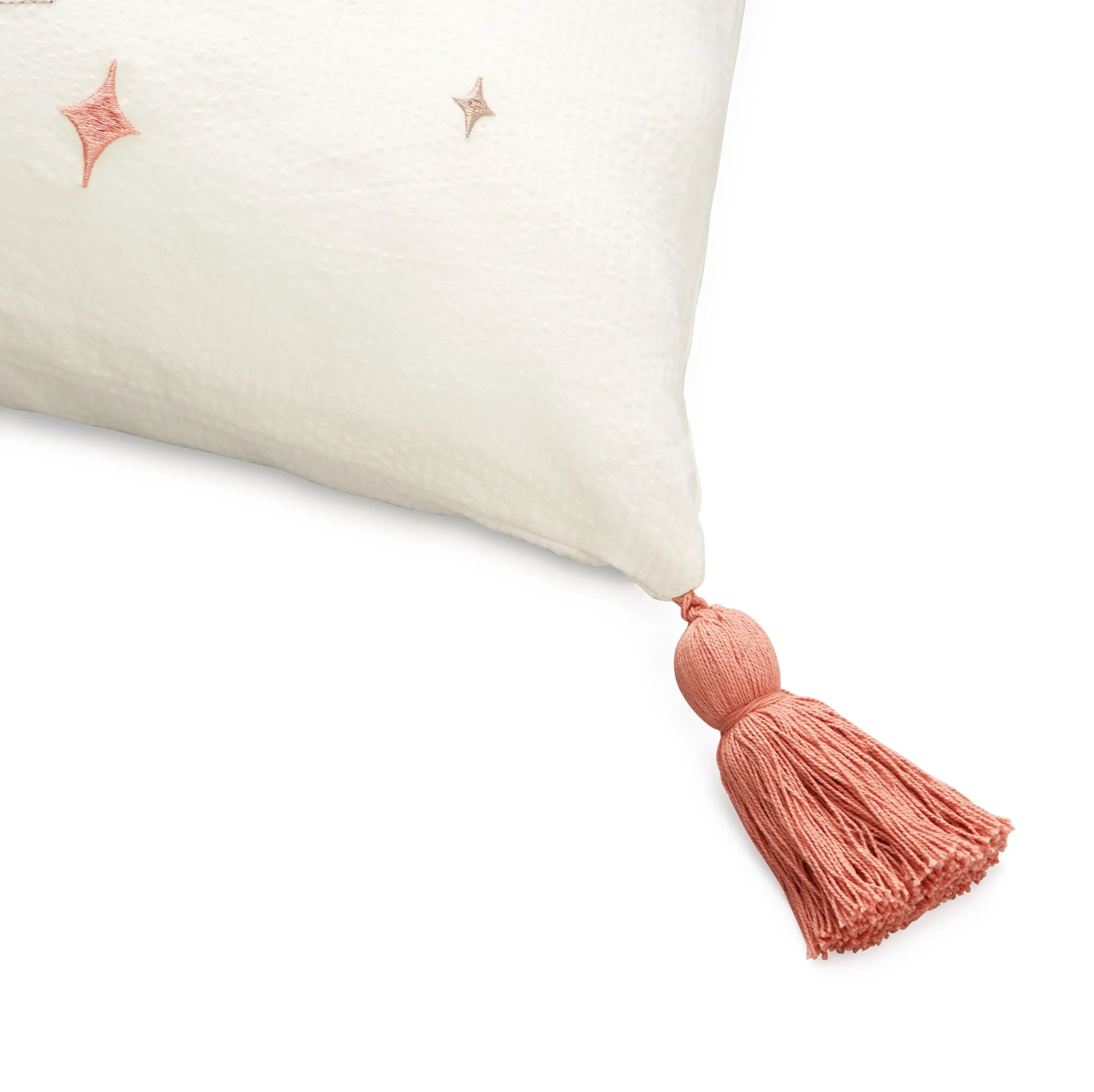 Нежна, везена декоративна перница со грациознa балерина што танцува меѓу светкави ѕвезди. Со елегантни реси и пресладок мотив, оваа перница ќе ги воодушеви и родителите и децата. Идеален декоративен додаток и прекрасен подарок што внесува топла и пријатна атмосфера со допир на винтиџ шарм во детската соба.