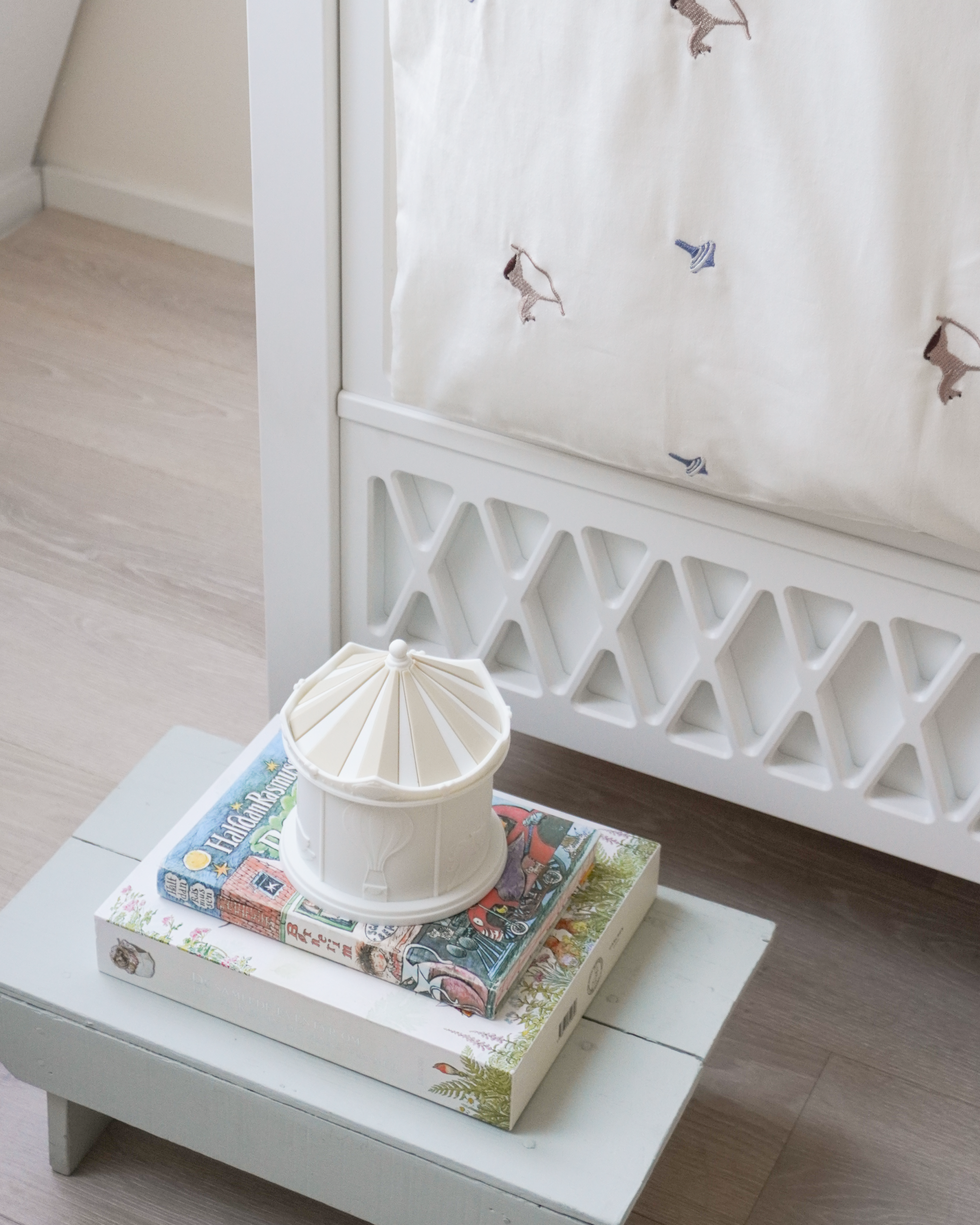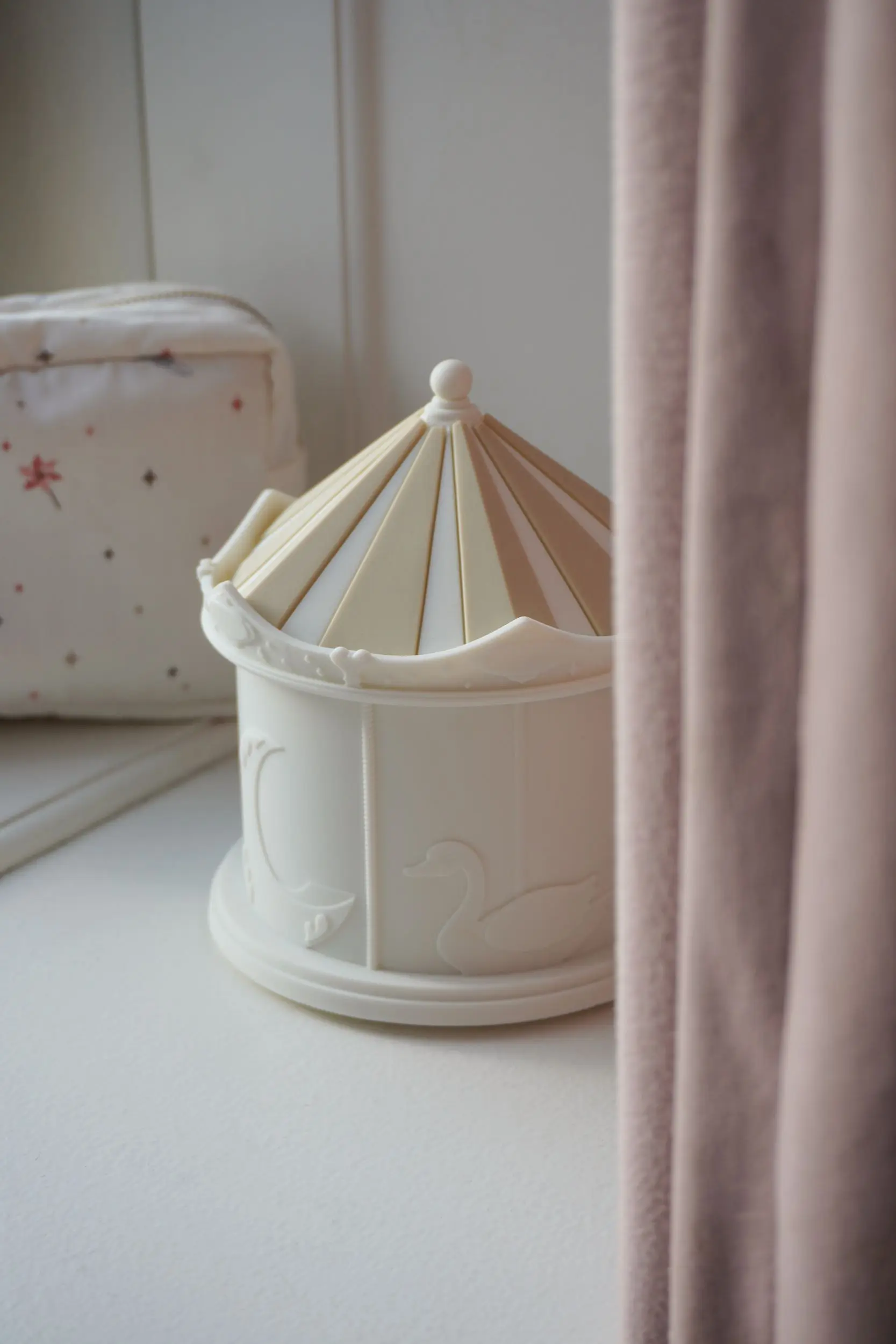 Инспирирана од магијата на винтиџ вртелешките, оваа прекрасна ноќна ламба создава бајковита атмосфера со својата топла и мека светлина, поттикнувајќи слатки соништа. Совршена е за пред спиење, за тивки вечери или како нежно светло покрај масата за пресоблекување и за ноќни хранења. Прекрасен декоративен елемент преку ден и утешен придружник навечер, оваа ноќна ламба е идеален додаток за во детската соба.