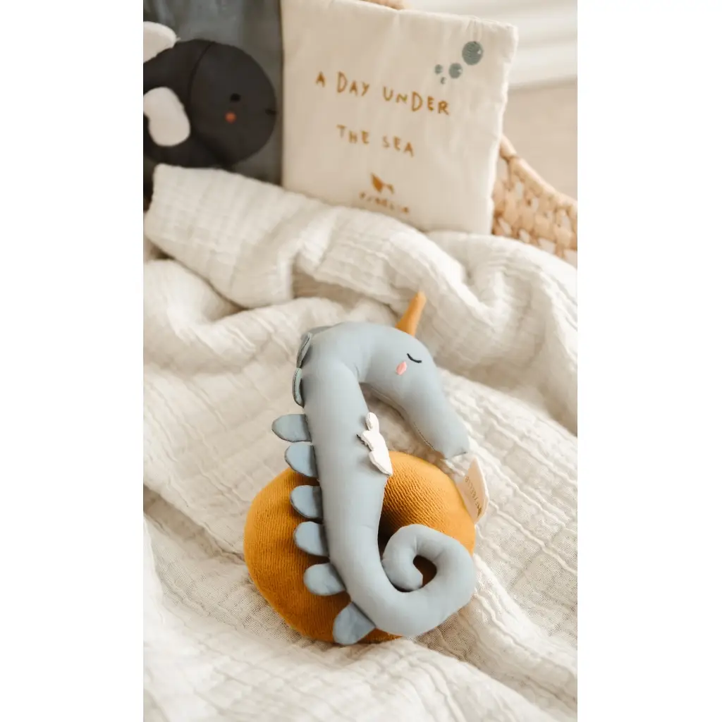 Кадифената памучна ткаенина со својата мека текстура му оозможува на вашето бебе да истражува и да открива различни сензации додека ја држи тропалката. Нежниот звук го стимулира вашето малечко и го поттикнува сензорниот развој.